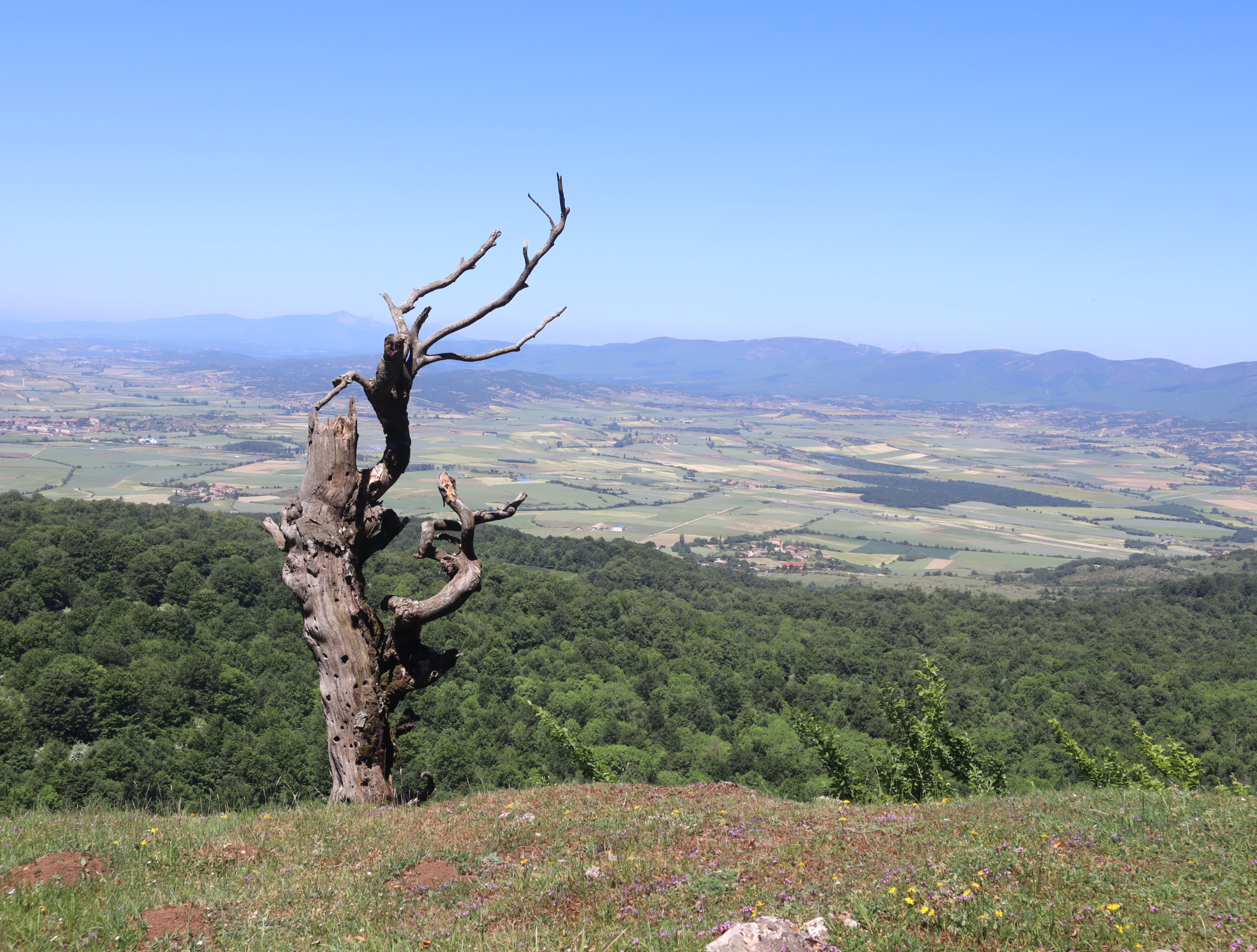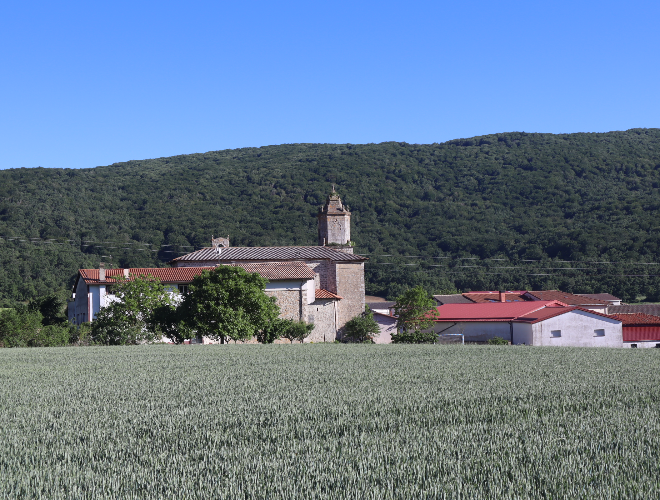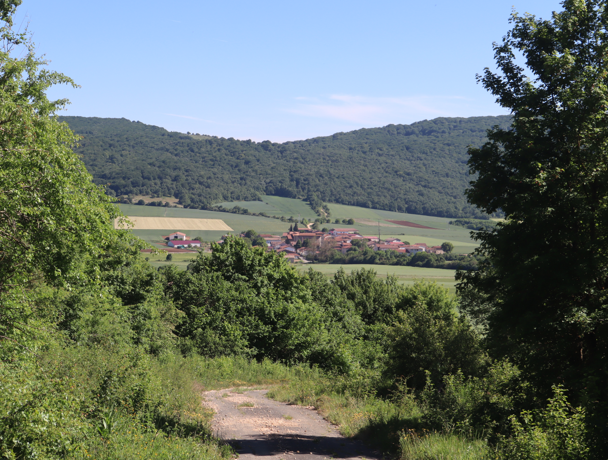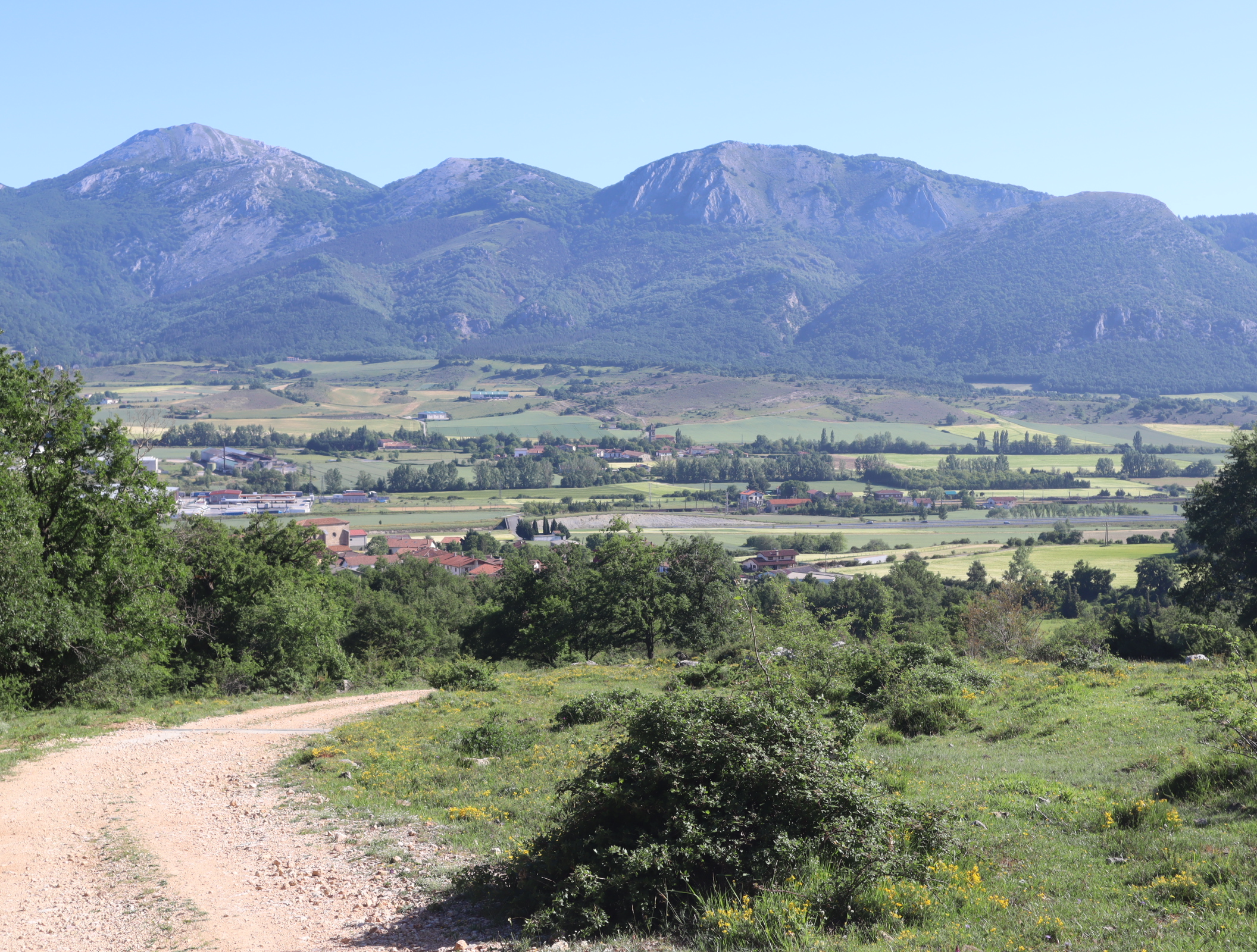 Daarna vervolgen we onze weg langs uitbundig bloeiende meidoornstruiken via een breed pad een berg omhoog. Na de top gaan we over een bospad tot we tussen de akkers van het Aranadal met haver en tarwe het dorp Ullibarri bereiken. Daar vragen we een jongeman die een doos met bekers draagt naar een bar. Een tweede man geeft ons een beker cadeau. We vinden de bar en nemen een biertje. Langs de kerk en de overdekte Pelote-baan lopen we het dorp uit naar het volgende dorp Alda.