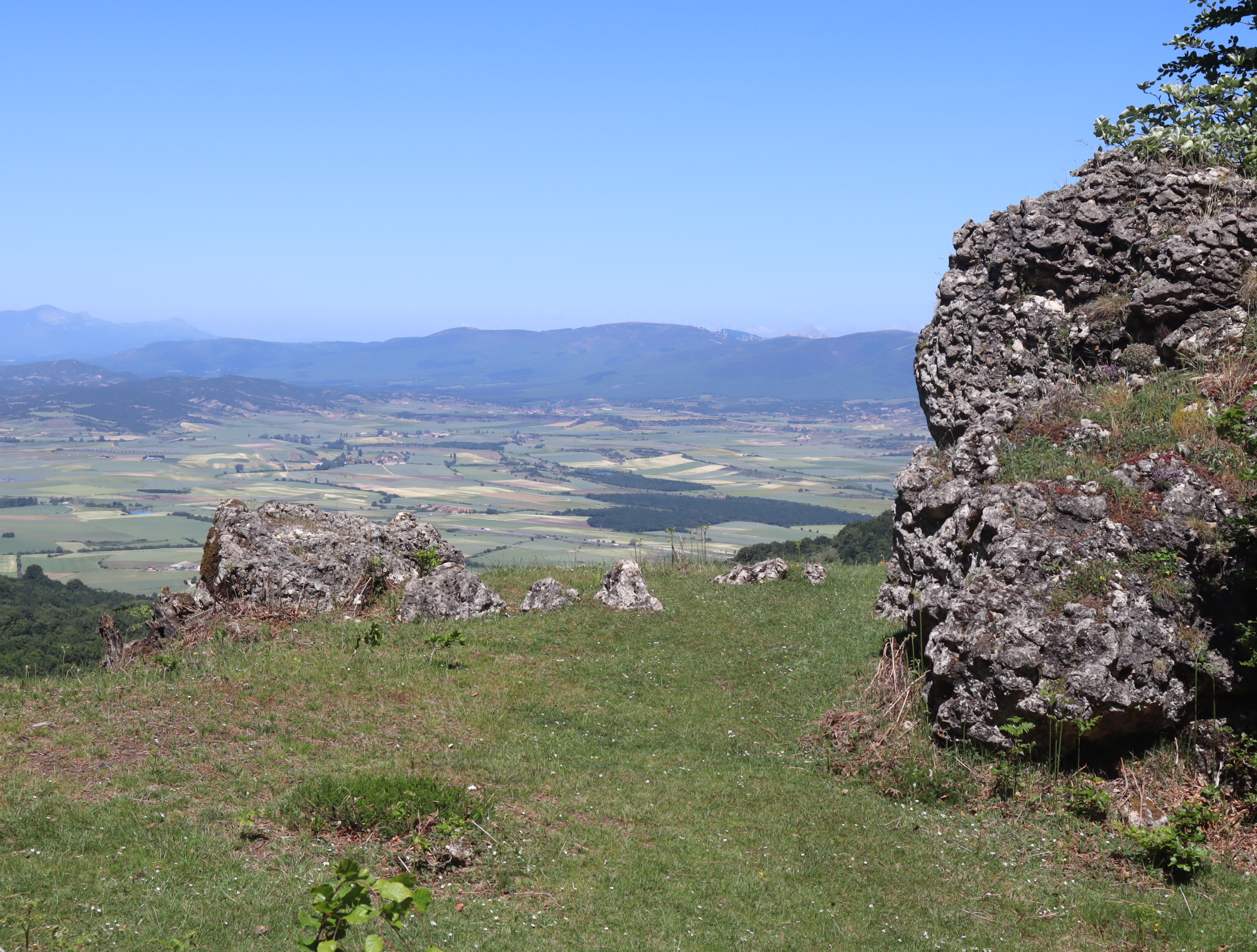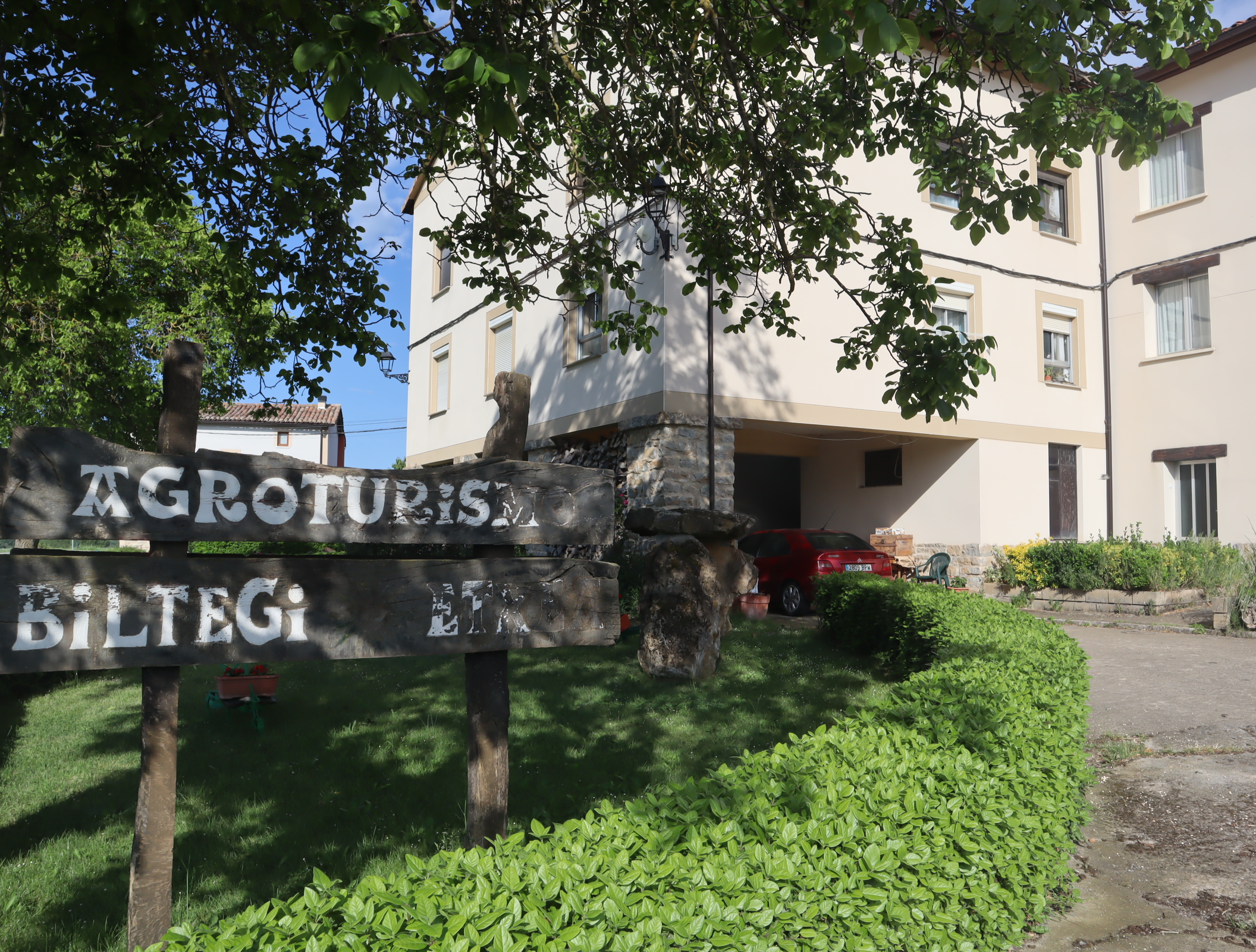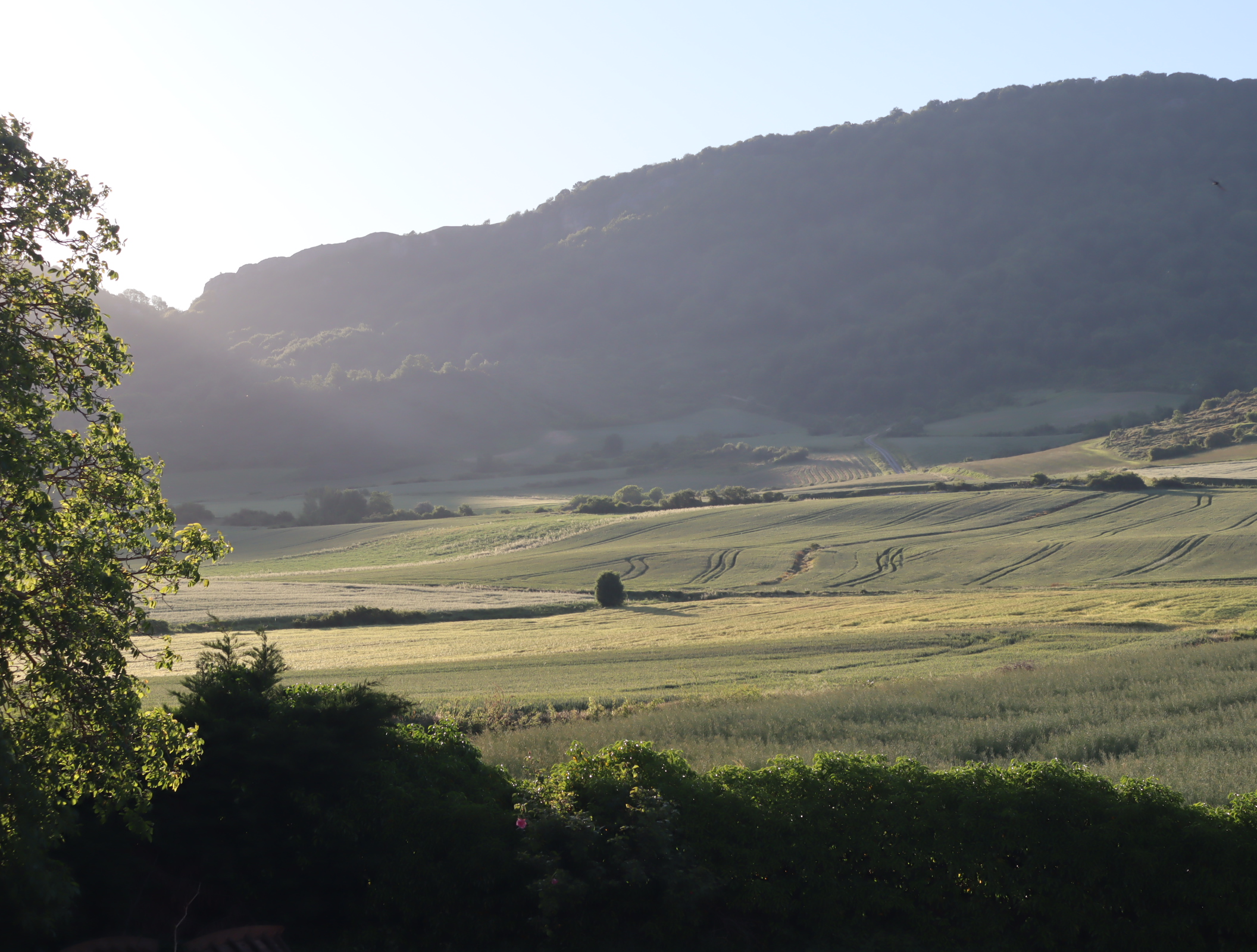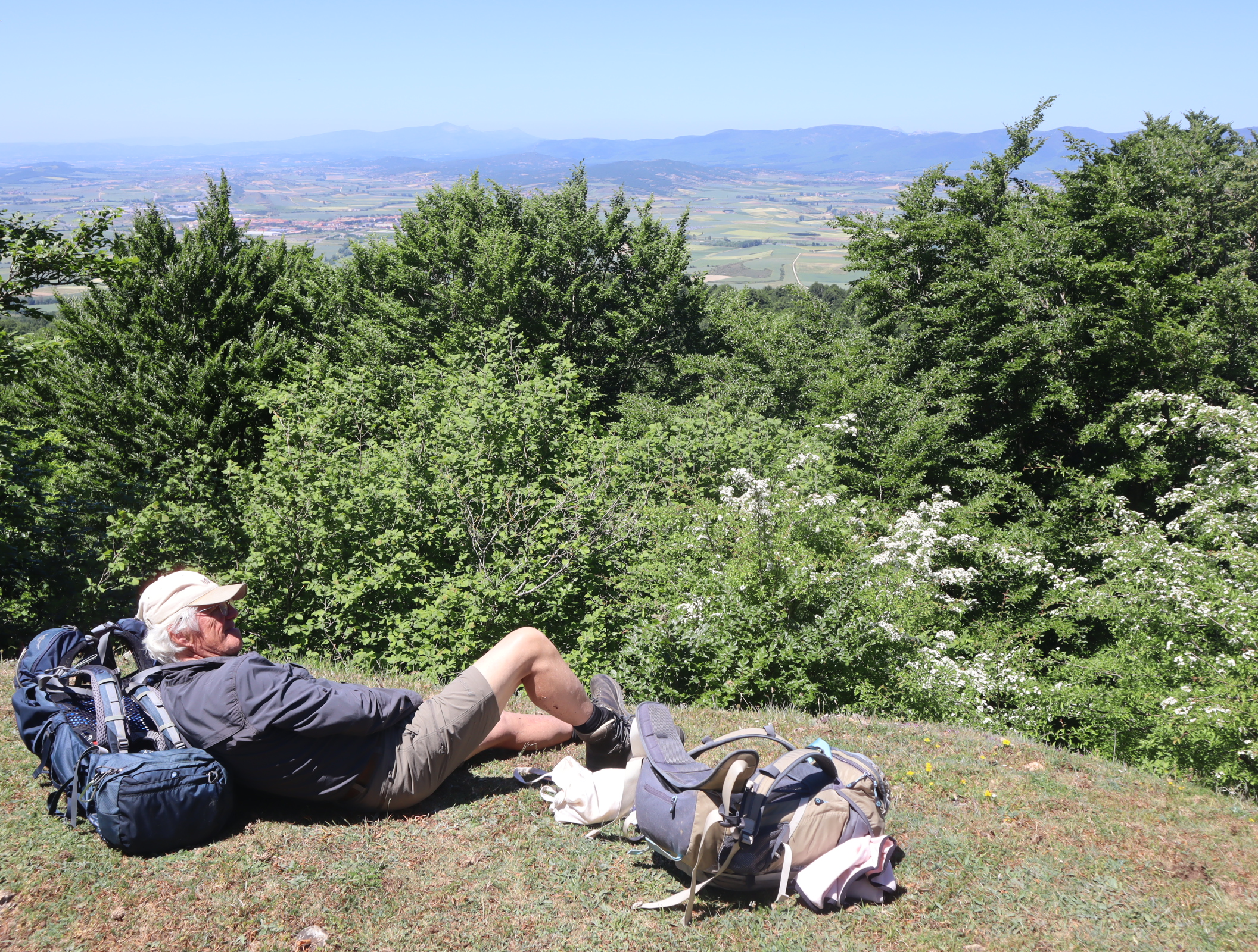 Daarna vervolgen we onze weg langs uitbundig bloeiende meidoornstruiken via een breed pad een berg omhoog. Na de top gaan we over een bospad tot we tussen de akkers van het Aranadal met haver en tarwe het dorp Ullibarri bereiken. Daar vragen we een jongeman die een doos met bekers draagt naar een bar. Een tweede man geeft ons een beker cadeau. We vinden de bar en nemen een biertje. Langs de kerk en de overdekte Pelote-baan lopen we het dorp uit naar het volgende dorp Alda.