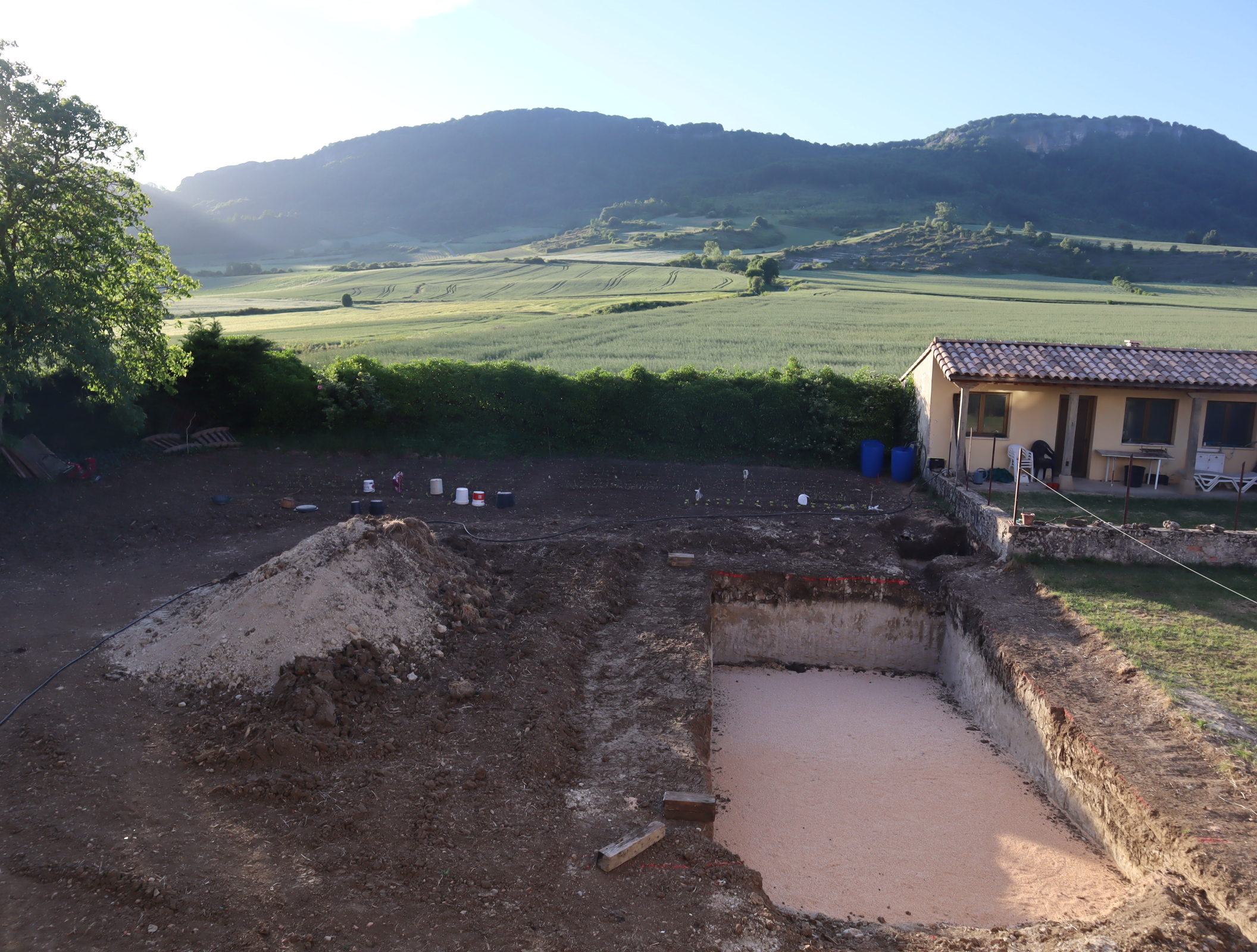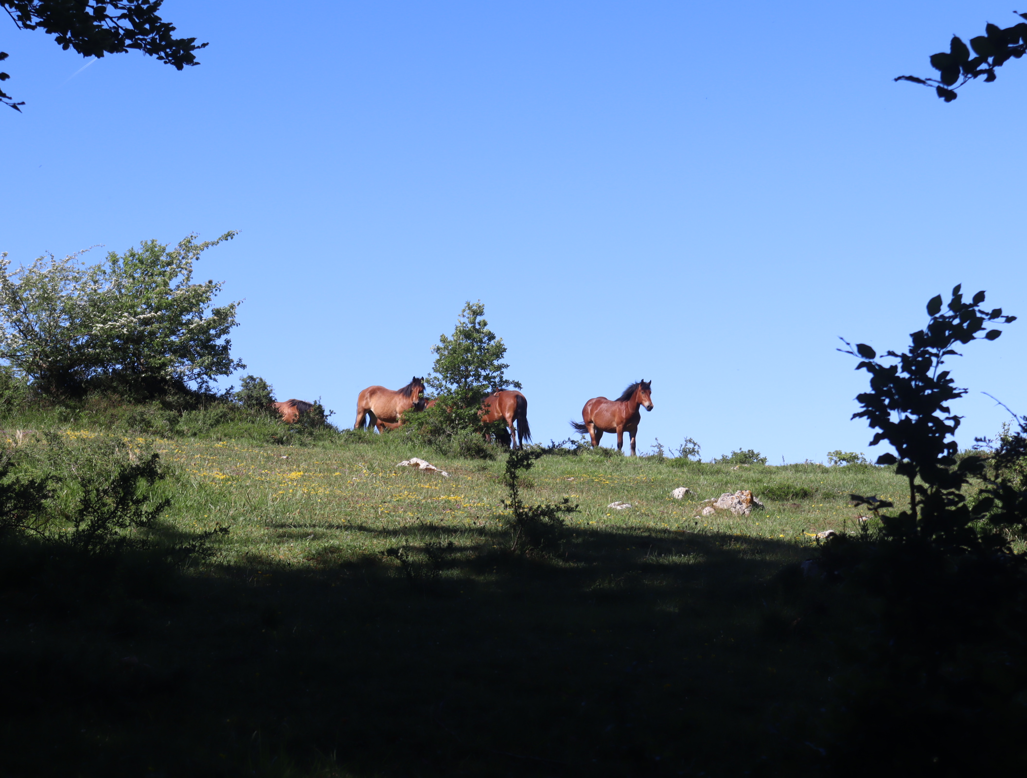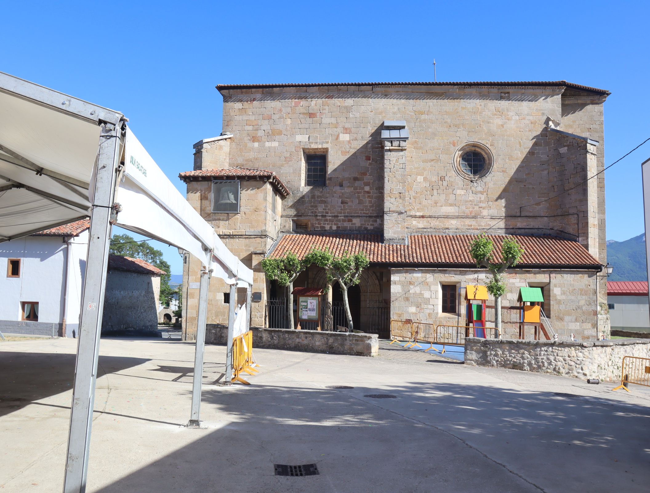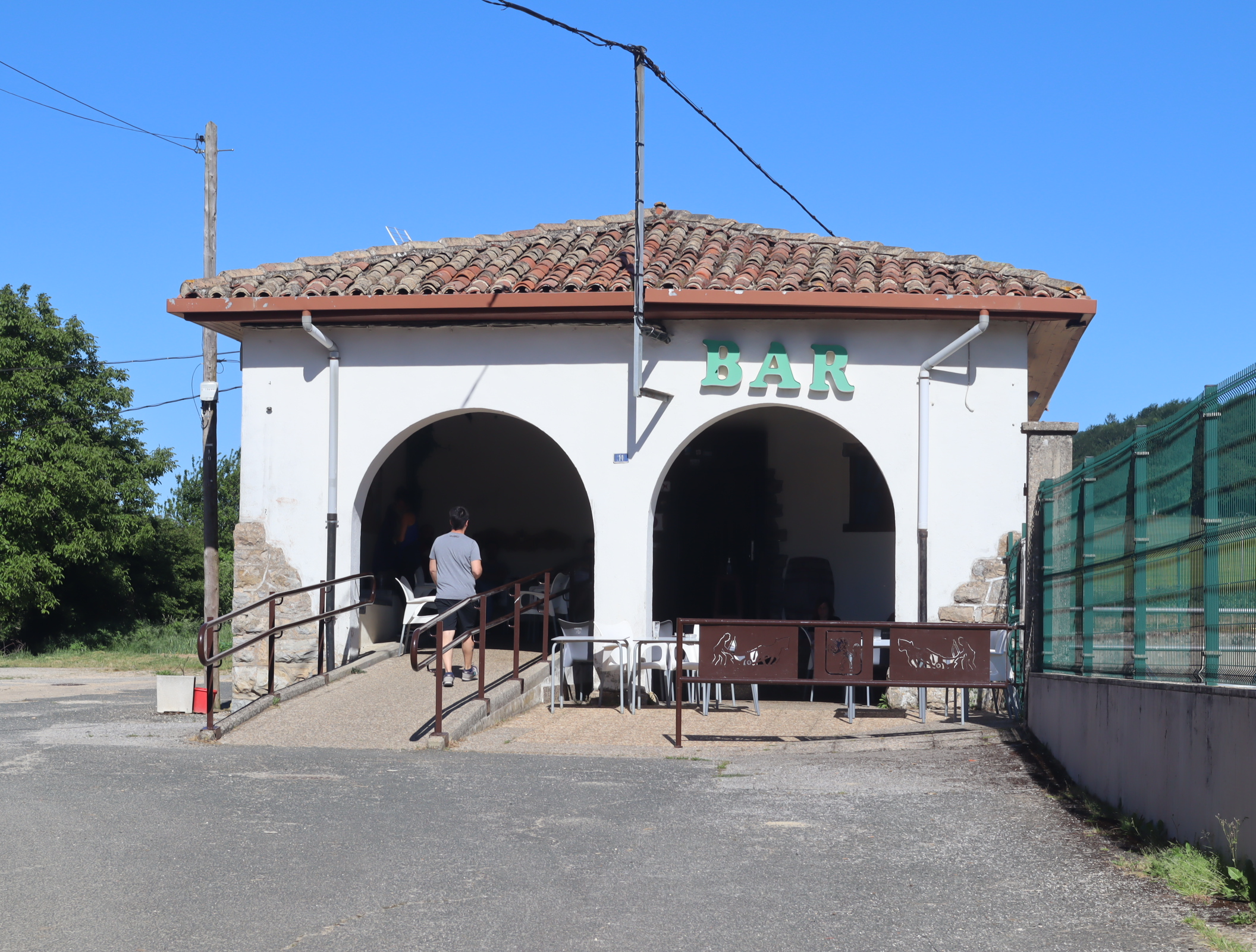 Daarna vervolgen we onze weg langs uitbundig bloeiende meidoornstruiken via een breed pad een berg omhoog. Na de top gaan we over een bospad tot we tussen de akkers van het Aranadal met haver en tarwe het dorp Ullibarri bereiken. Daar vragen we een jongeman die een doos met bekers draagt naar een bar. Een tweede man geeft ons een beker cadeau. We vinden de bar en nemen een biertje. Langs de kerk en de overdekte Pelote-baan lopen we het dorp uit naar het volgende dorp Alda.