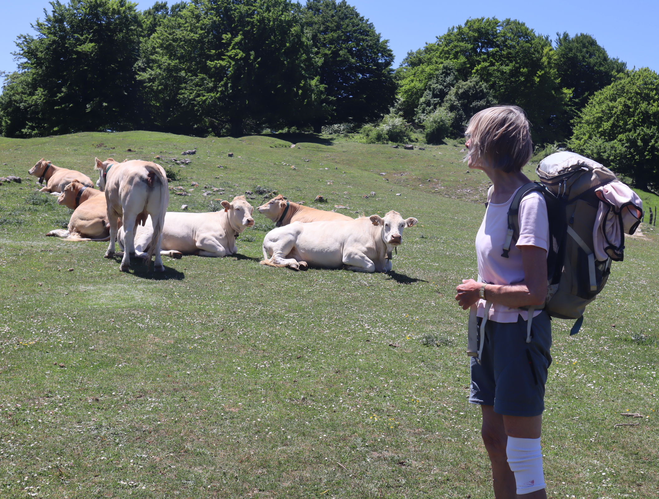 Vervolgens lopen we door mooi open landschap. Bij een weg is een picknickplaats waar meerdere campers staan. We steken over en wandelen verder door het natuurpark. Voor ons zien we een ree wegspringen. We nemen een bospad. Ineens struikelt Mariette over een verraderlijke worteltak en valt plat voorover. Ze blijft liggen, ik ontdoe haar van de rugzak en help haar te gaan zitten. Ze heeft een bloedneus en een blauw opgezwollen oog. Ze is op haar linkerpols gevallen, waardoor deze later blijkt gekneusd te zijn. Als ze wat is bekomen van de schrik en het bloeden met mijn zakdoek is gestopt, komt ze overeind. We stellen vast dat er niets is gebroken. Wanneer we alles weer wat op orde hebben gebracht, gaan we in het gras in de zon zitten en drinken wat.