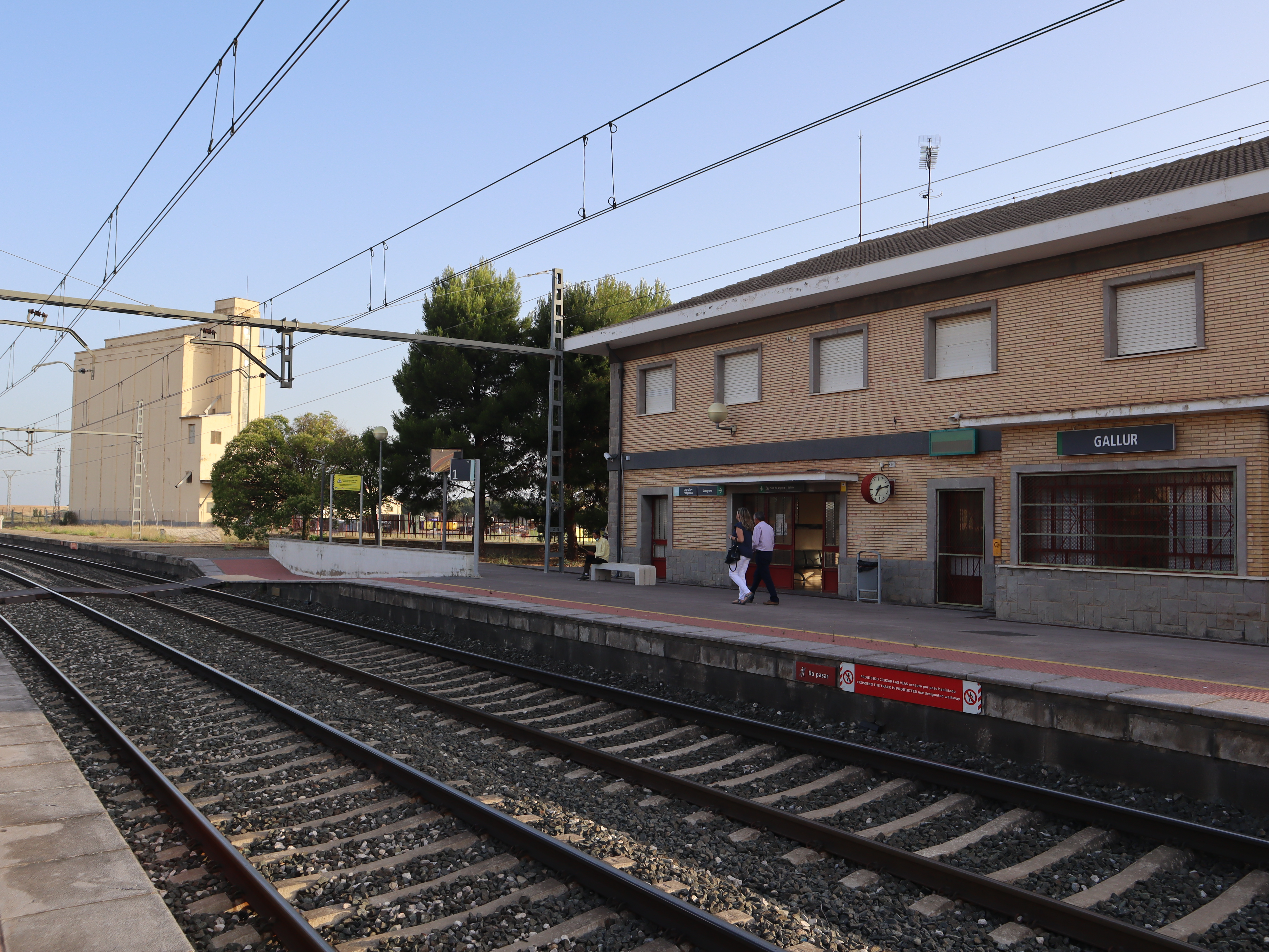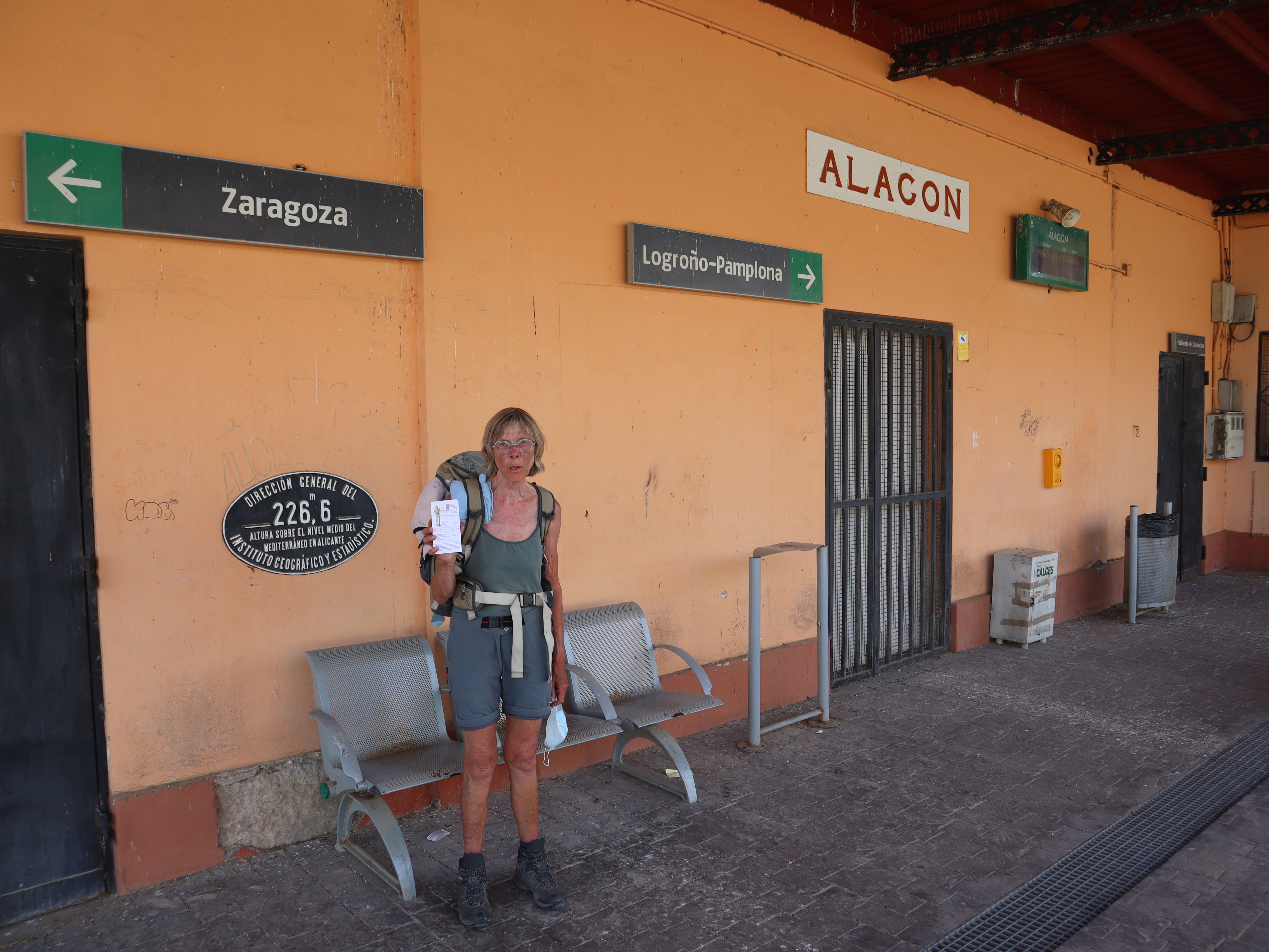 Het is inmiddels weer erg warm geworden. We lopen langs de weg achter elkaar met de paraplu op. Eerst is het nog rustig maar na een afslag lopen we langs een drukke verkeersweg. Niet fijn. We verlaten de weg via een tunneltje. Niet veel later lopen we de stad Alagon binnen. In het centrum zoeken we een plek om wat te drinken. Bij een restaurant gaan we eerst op het terras zitten. Binnen is het koeler dus verkassen we. We eten tapas en drinken wat en gaan daarna op zoek naar het station. Daar nemen we de trein naar Zaragoza.