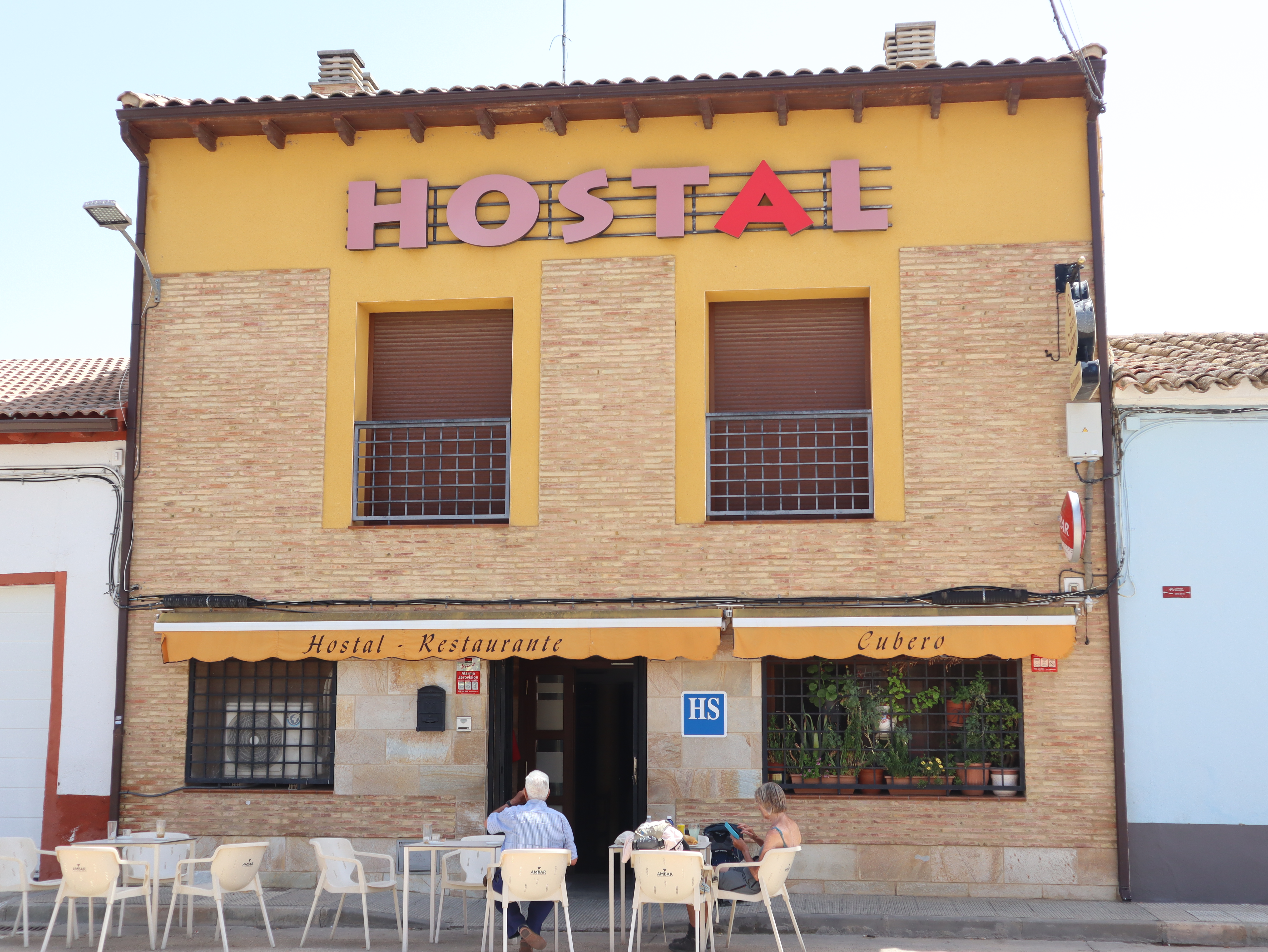 Inmiddels loopt het tegen de middag als we Cabanes de Ebro binnen lopen. Er heerst rust op dit tijdstip. We lopen even naar de kerk om te constateren dat deze niet bijzonder is. Dan gaan we op zoek naar een terras om wat te eten en te drinken. Wanneer we een paar tafels en stoelen tegen de stoeprand zien staan gaan we er zitten. We bestellen chorizo-tortilla met brood. Het blijkt dat we op het terras van een Hostal zitten.